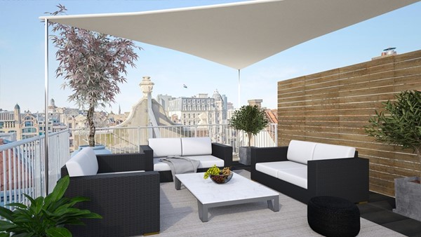 U zit op het terras, de middagzon op uw gezicht, terwijl uw blik langzaam over de Lijnbaansgracht glijdt. Geluiden van Amsterdam vormen een zachte achtergrond en ongemerkt dwaalt uw gedachten af naar een andere tijd. Want precies hier, waar u nu in alle rust geniet van ruimte en uitzicht, lag in 1612 de rand van de stad. Over de lange lijnbanen langs het water liepen touwslagers af en aan, bezig met het draaien van scheepstouwen voor de groeiende handelsstad. De eeuwen gingen voorbij en de plek bleef in beweging. Waar ooit touw werd geslagen, klonk later het ritme van de bekende Klene-fabriek, waar tot 1988 de karakteristieke muntdrop werd geproduceerd. En juist op deze historisch gelaagde locatie staat vandaag Residence Le Jardin. Hier, op de bovenste (5e) verdieping, bevindt zich dit penthouse van circa 92 m², waar het uitzicht over de gracht onderdeel wordt van het dagelijks leven. Het royale dakterras van 19 m² op het zuidwesten strekt zich uit over de gehele breedte van het appartement en vormt een natuurlijke verlenging van de woonruimte — een plek voor lange avonden in de zon, een kop koffie in de ochtend of simpelweg het ervaren van de stad onder u. Binnen ervaart u dezelfde rust en lichtheid, met alle comfort van nu, inclusief een privé parkeerplaats en een praktische berging in de ondergelegen parkeergarage. Buiten wacht de stad; levendig, dichtbij en altijd binnen handbereik.De winkels van de Elandsgracht, De Negen Straatjes en de Leidsestraat liggen om de hoek, net als theaters, musea en het Vondelpark. Hier woont u niet alleen op een bijzondere plek! U wordt onderdeel van een verhaal dat al eeuwen wordt geschreven.