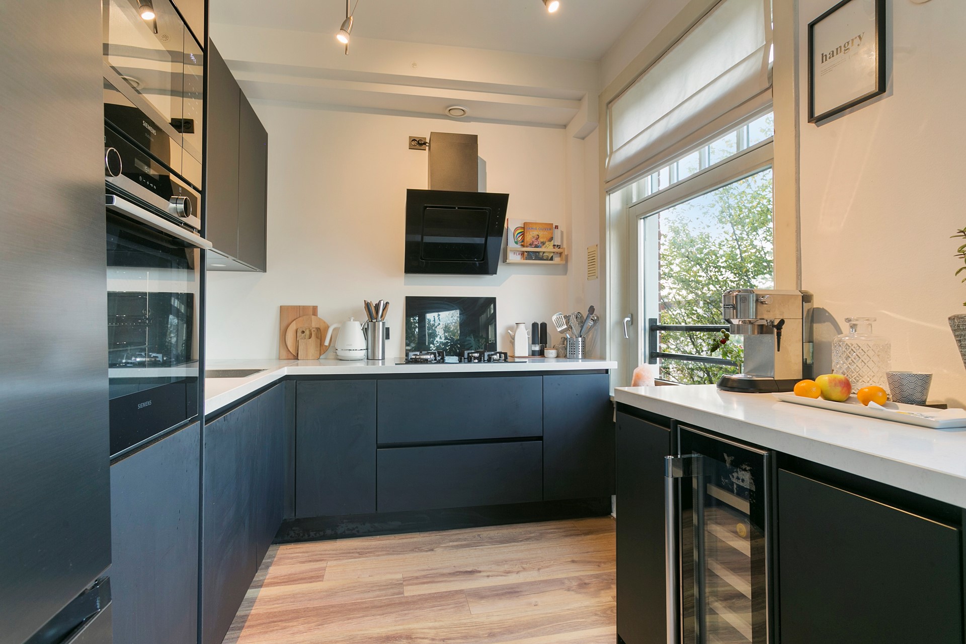 De living is slim ingedeeld met een zithoek aan de achterzijde en een eetgedeelte aan de voorzijde, waar je kunt dineren met uitzicht op de dynamiek van de stad. De open keuken is volledig vernieuwd en 100% uitgerust met alle benodigde inbouwapparatuur.