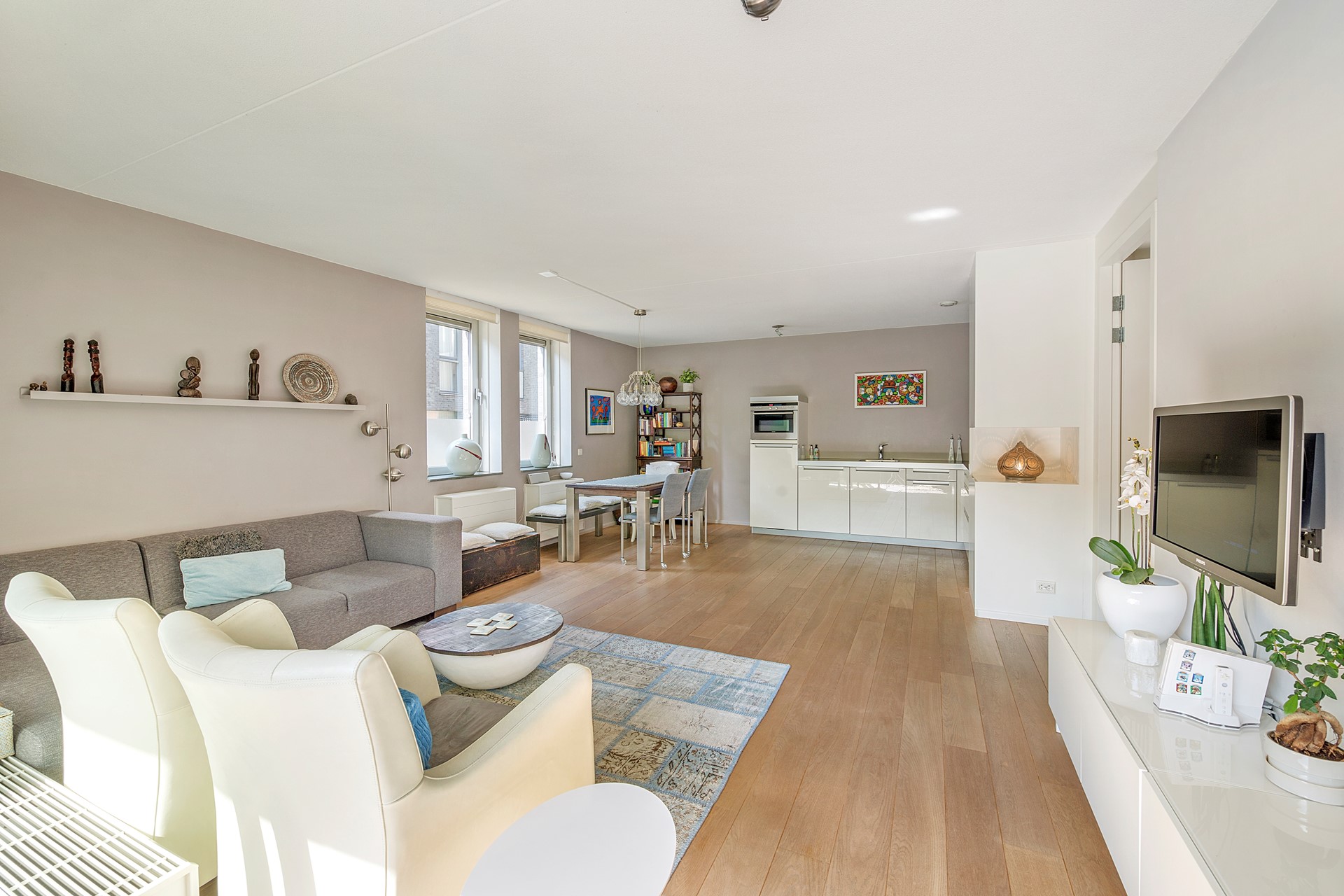 Binnen is het appartement praktisch ingedeeld en verzorgd afgewerkt. De drempelloze eikenhouten vloer loopt door het gehele appartement en geeft een rustige, warme uitstraling. De brede raampartijen en slimme indeling versterken het open karakter van de woonkamer.