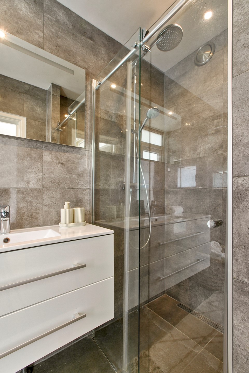 De badkamer is modern en functioneel, voorzien van een douche en wastafel, en biedt directe toegang tot het tweede balkon. Het separate toilet zorgt voor extra comfort in het dagelijks gebruik.