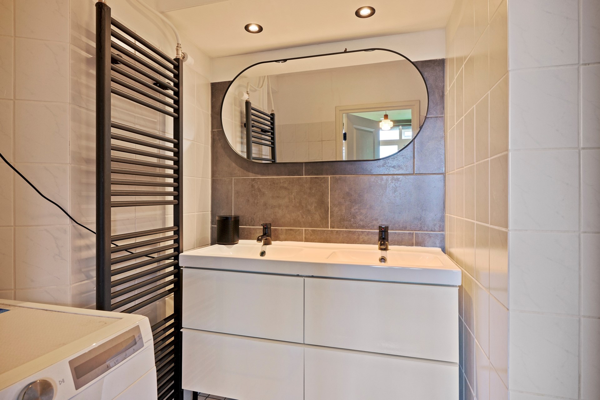 At the rear are the kitchen and bedroom with ensuite bathroom, featuring a shower, double washbasin, and washing machine connection.