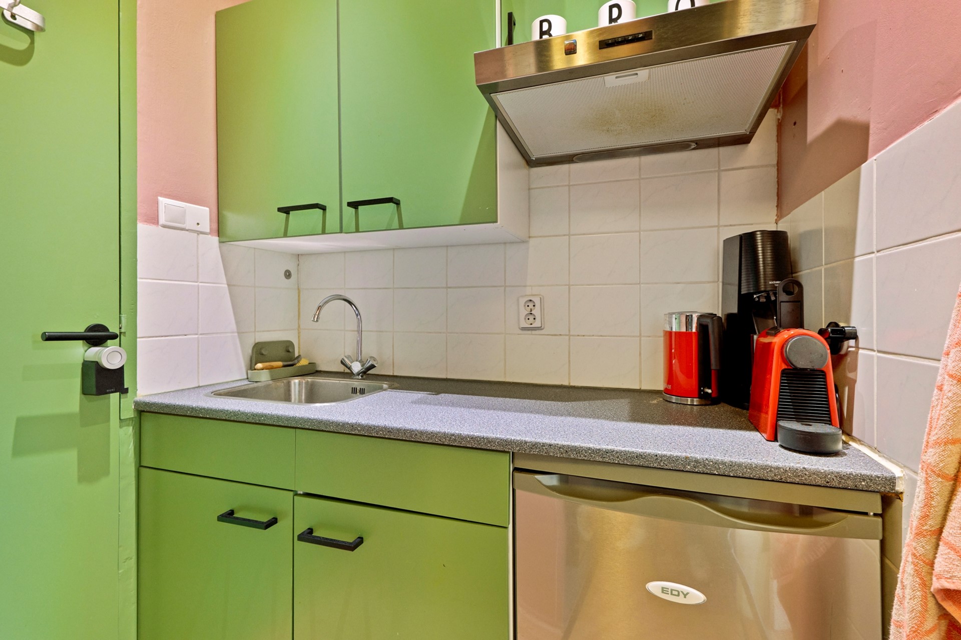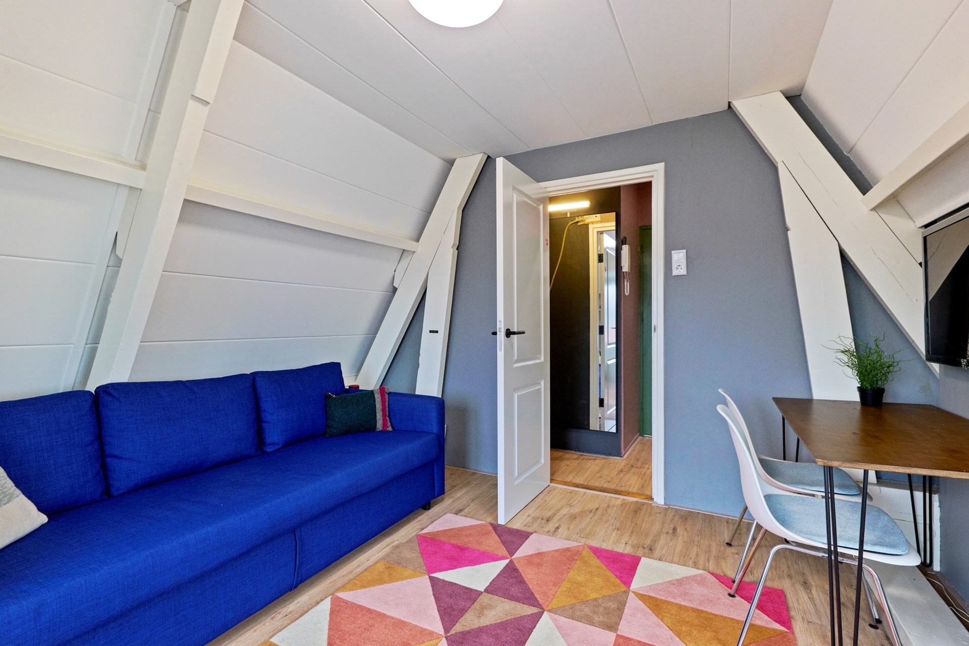 De vierde etage biedt een zelfstandige studio met woonkamer/slaapkamer, kitchenette en badkamer met douche en toilet – ideaal als gastenverblijf, thuiswerkruimte of woonruimte voor logés.